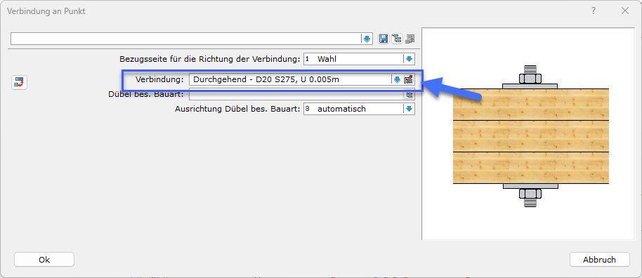 Für Visualisierung und Materialliste sollten die gewünschten Verbindungsmittel über die entsprechende Identnummer eingetragen sein (im Baudaten-Programm hinterlegt).