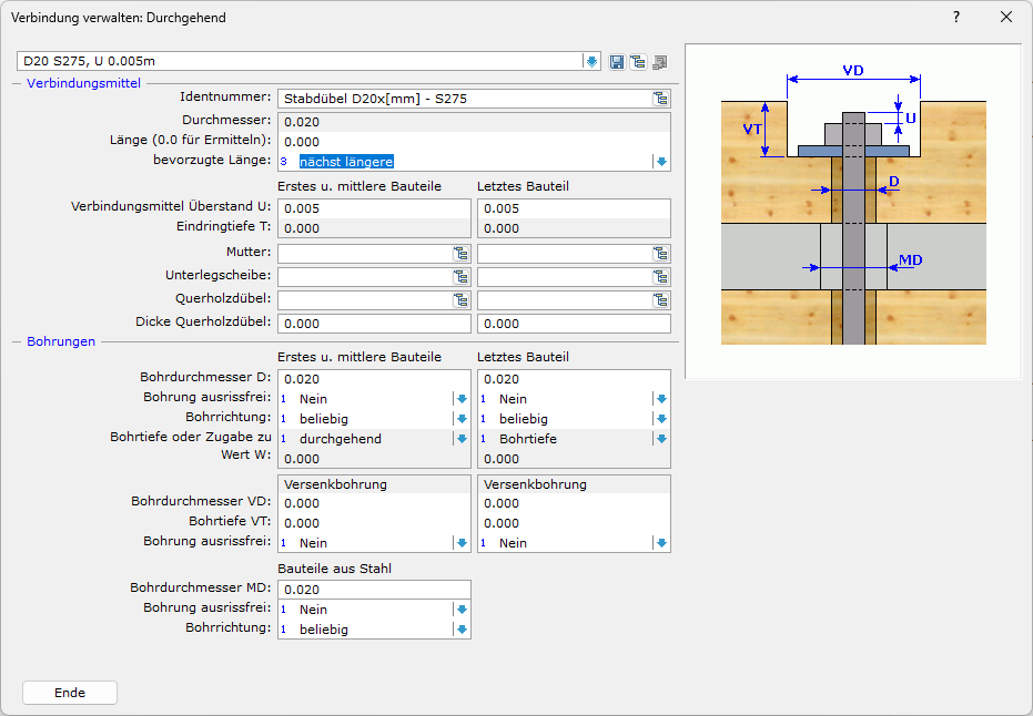 In der Funktion Verbindung verwalten 3‑08‑8 – durchgehend können sowohl Verbindungsmittel als auch Bohrungen konfiguriert werden.